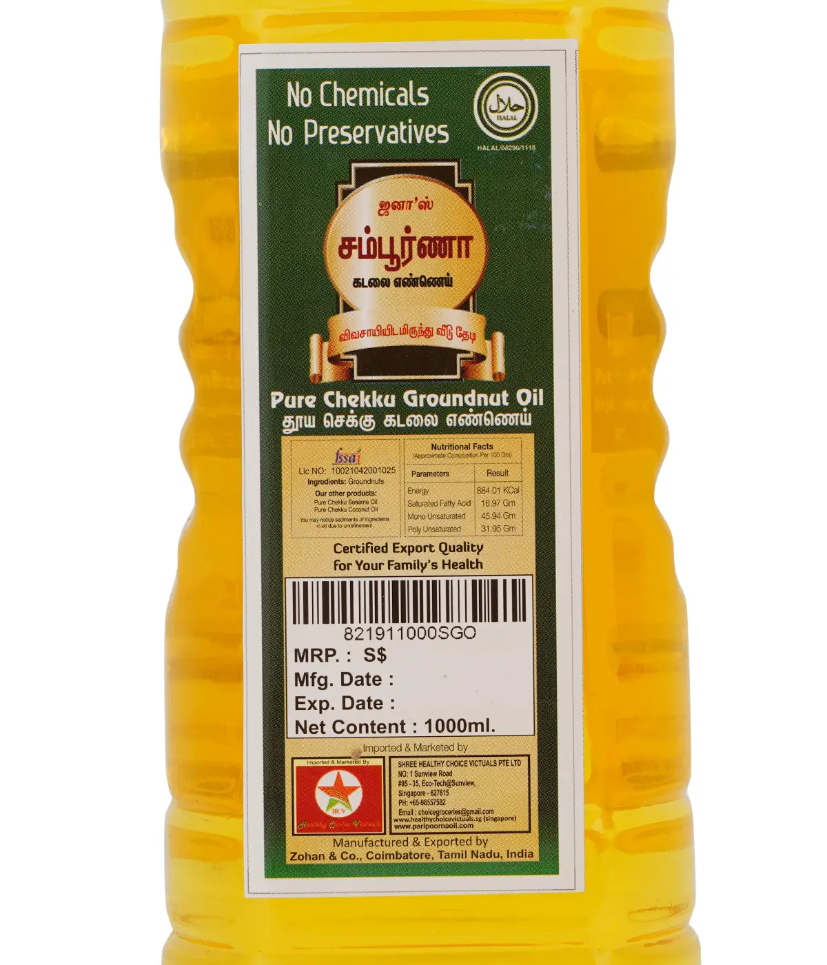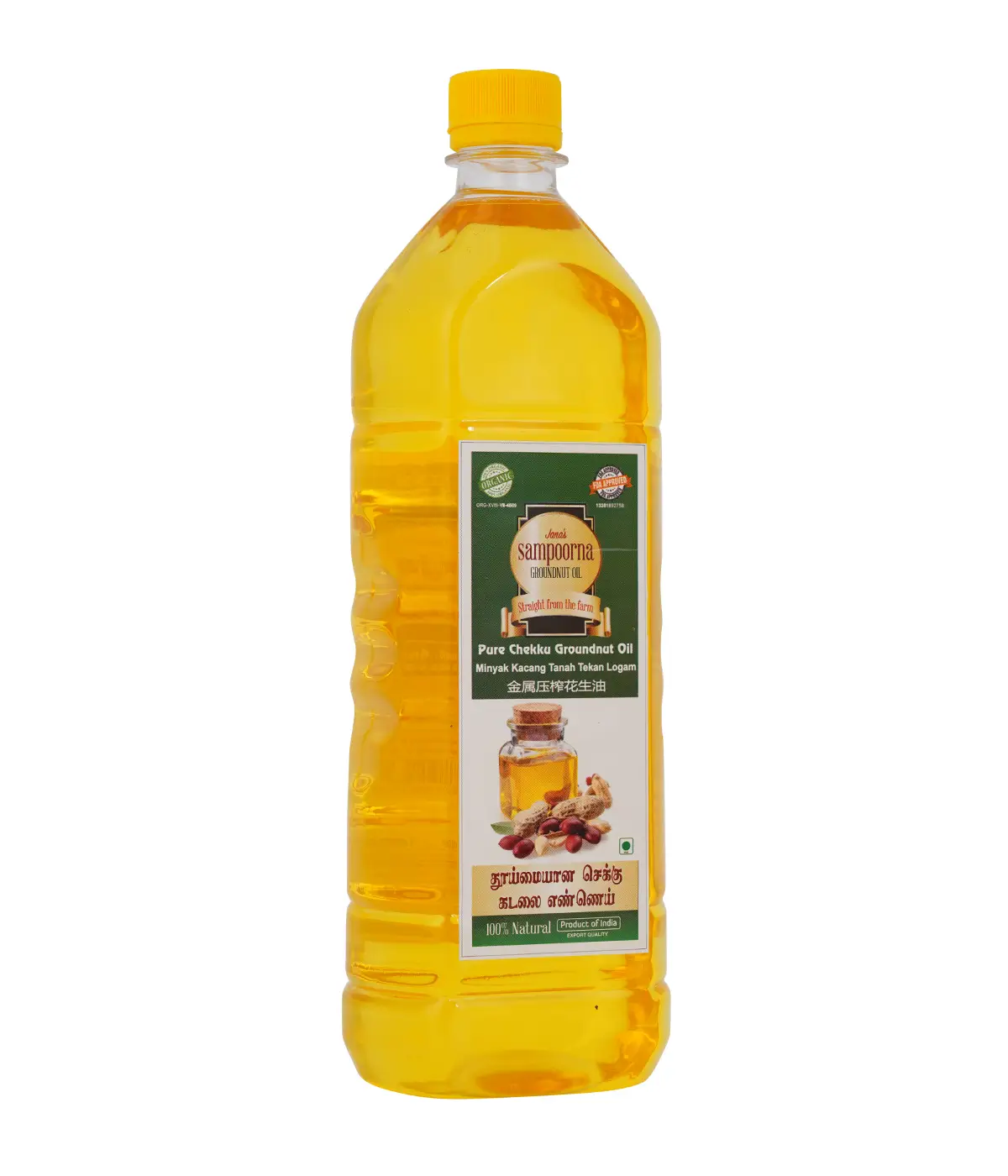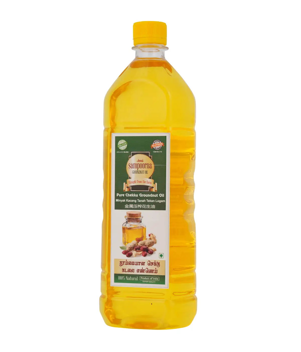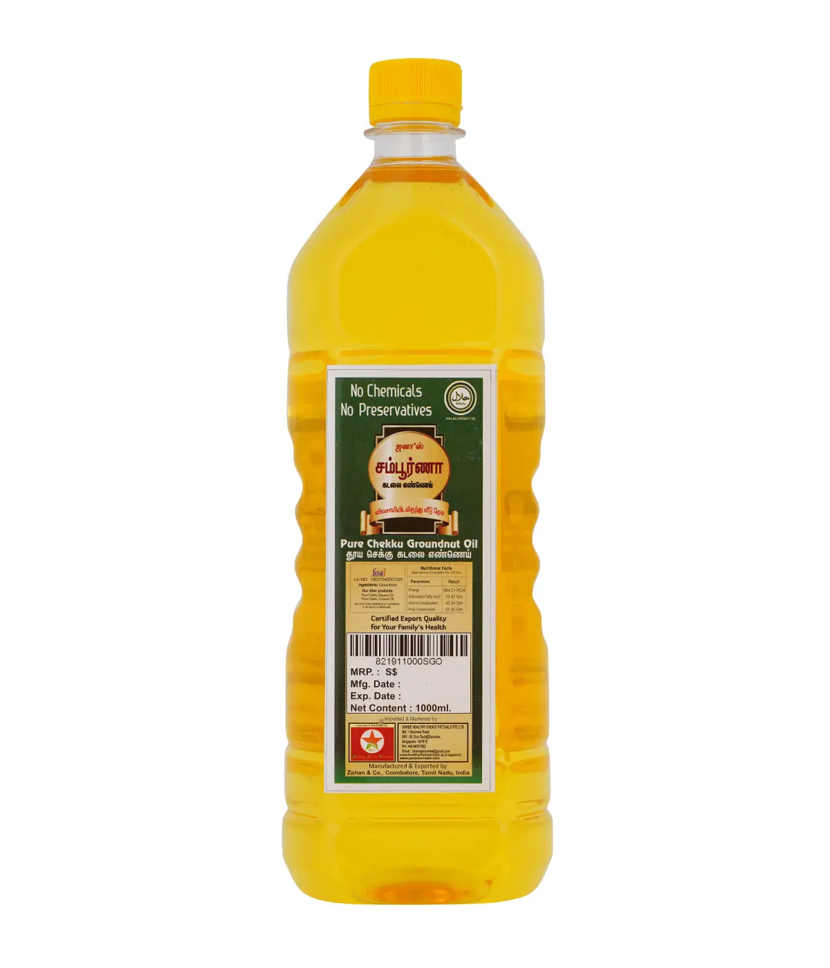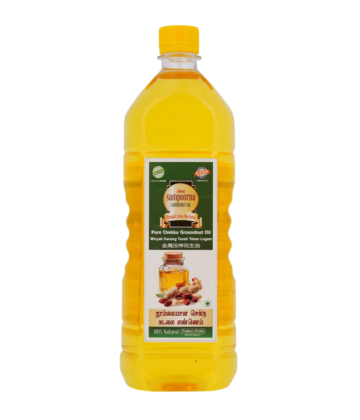 Metal Pressed Oils (Chekku / Ghani) Organic, Halal, FDA Certified Product for cooking. 100% Natural first quality groundnut/peanut seeds directly purchased from the farmers and hygienically extracted using traditional method and sunlight/single filtered oils Recommended for general cooking.