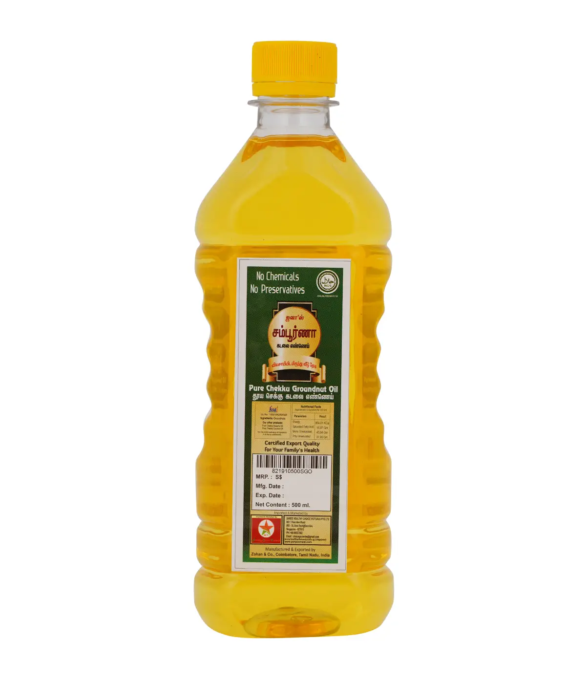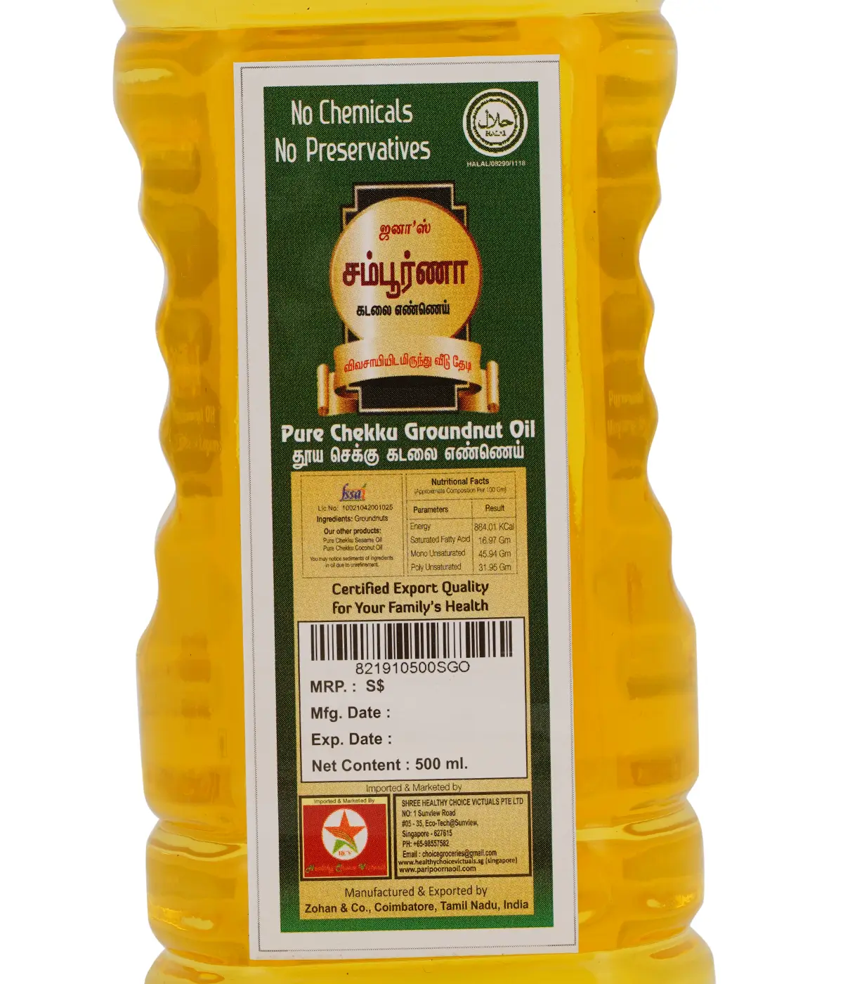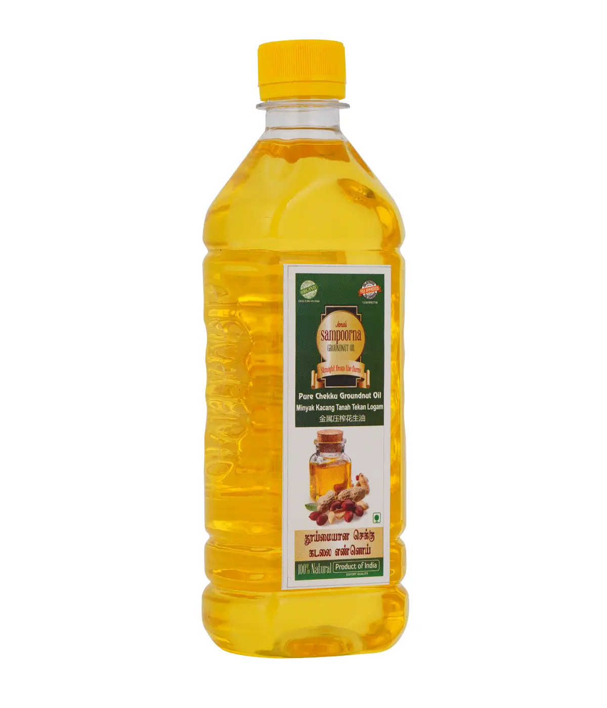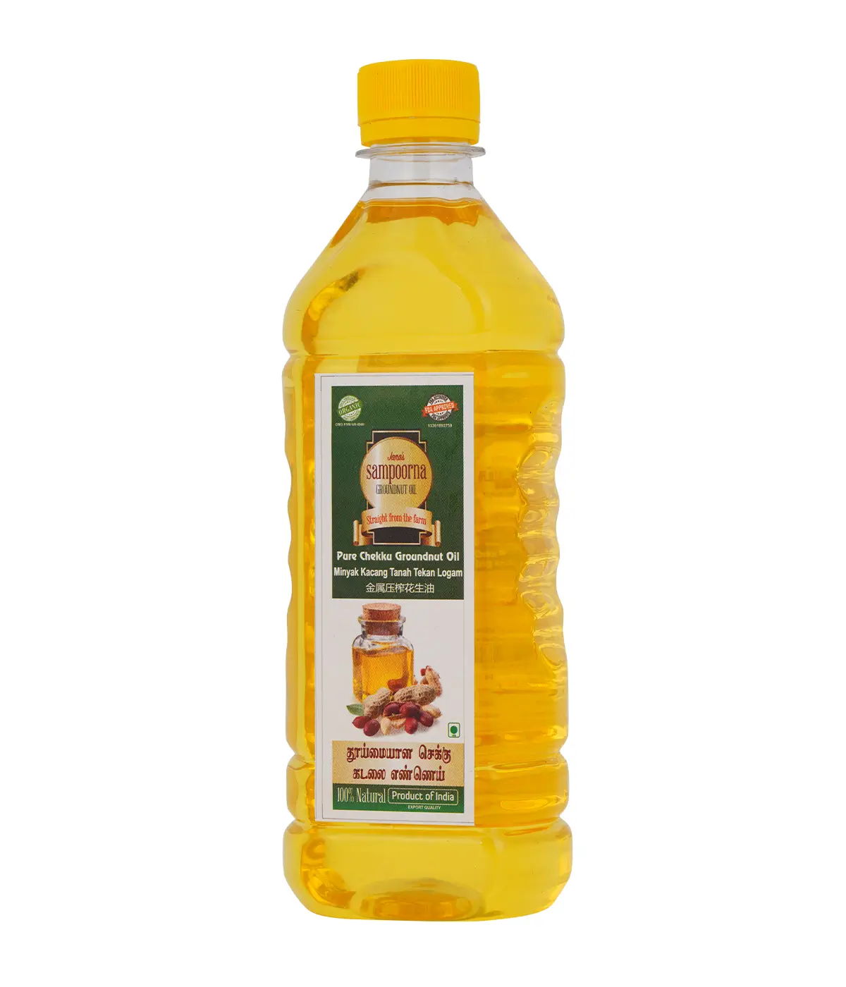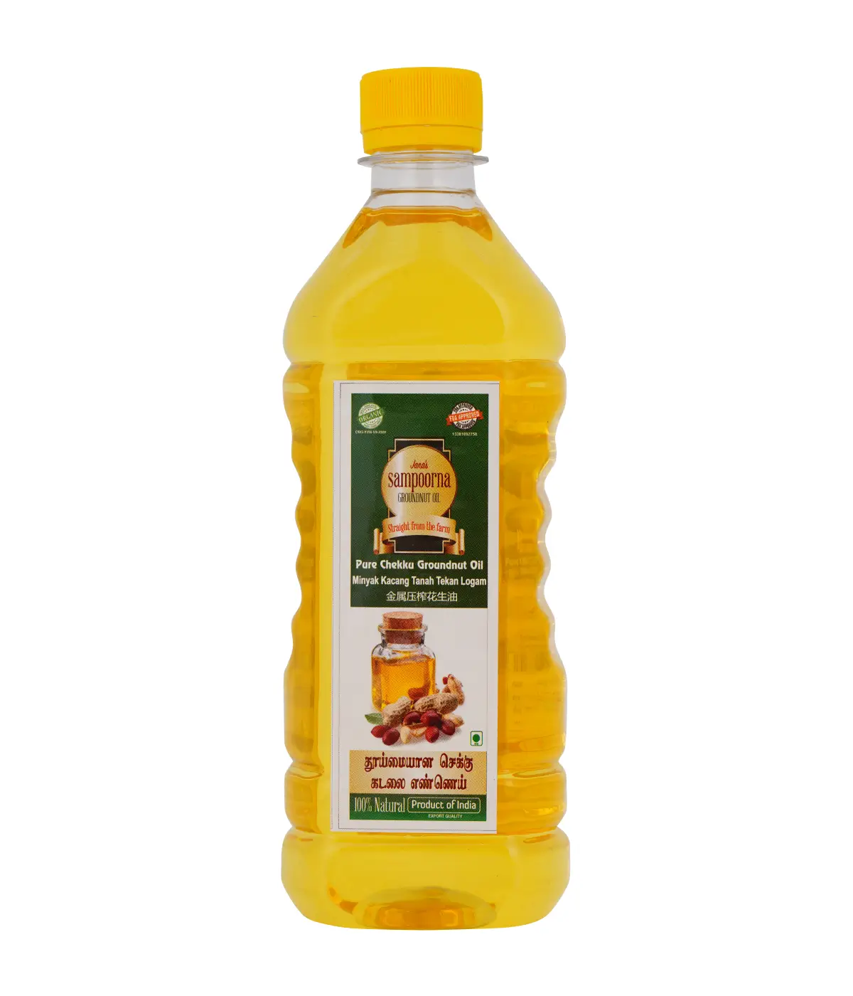 Metal Pressed Oils (Chekku / Ghani) Organic, Halal, FDA Certified Product for cooking. 100% Natural first quality groundnut/peanut seeds directly purchased from the farmers and hygienically extracted using traditional method and sunlight/single filtered oils Recommended for general cooking.