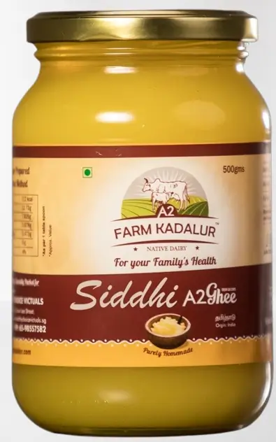 Farm Kadalur – Pure Organic Ghee made from native Indian breed country cow milk through traditional method which enhances taste of any dish made with Siddhi A2 Cow Ghee Premium is delicious as well as healthy. Cows are fed with organic fodder, naturally grown grass within the farm and there are no extra boosters fed for increasing volume of milk – Pure Ghee from trustable source only limited qty supply.